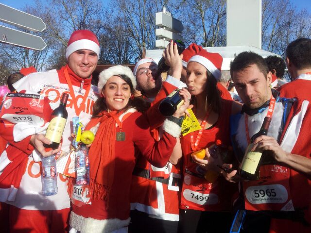 3ème tour: plus de cerveau. Esprit de plus en plus positif. Jambes fatiguées. Souffle ok. Décompte des km avant le finish enclenché. Toujours pas la moindre idée de mon temps, ça me va - même pas perturbée. Je suis fière parce que je ne lâche rien et que c’est la seule chose que j’attends de moi même. Pour le chiffre qui viendra derrière, on verra plus tard. Je crache plusieurs fois sur le côté de la route; loin bien loin de ma pudeur habituelle faisant qu’une fille ne peut tout simplement « pas faire ça ». Je m’en fous. 9ème km. Plus qu’un. Je suis entourée par 3-4 hommes qui ne me lâchent pas et qui n’ont pas l’air d’avoir très envie de rester derrière. Il reste 500m. Je leur emboîte le pas. Ils accélèrent. Ça m’énerve. J’ai envie de les laisser passer et là, une femme sortie de nulle part se jette sur moi et se met à me gueuler dessus « allezzzz, tu lâches rien, tu allonges, il te reste 200m, allez allez allez ». Mais d’où elle sort celle là ? Bref, ça me booste, j’accélère, j’accélère, j’ai envie de la remercier mais je peux pas tout faire en même temps. Je vois l’arche, je sprinte, je sprinte, je sprinte. Finish. [Merci Madame]. Je me jette sur une barrière, j’hésite entre vomir ou m’évanouir. Je regarde mon téléphone. Je suis dans les 51′. Verdict final: temps officiel 51’07, temps réel 50’49 - 45ème femme, 24ème de ma catégorie. Je suis 1′ tout pile au dessus de mon RP (10km de Boulogne 2013) mais franchement, franchement…j’ose être satisfaite de cette expérience et de ce résultat. Les 3 mecs me repèrent et viennent me rejoindre rapidement. « Salut les mecs, je vais mourir et je reviens ». [rires]. Clément est hyper heureux, il a battu son record personnel et a fini en 47’10 temps réel - mené tout le long par Jérémy, brillamment improvisé lièvre pour l’occasion ! Ludovic finit quant à lui en 41’50, fidèle à ses capacités d’ex-footeux récemment converti au running ! Eugénie arrive quelques minutes après, un peu déçue par son chrono de 53′ et quelques mais là aussi, amplement justifié par une baisse de forme contextuelle. Fanny quant à elle, menée par son frère et un ami, bat largement son record personnel, ravie, en 54’44 !